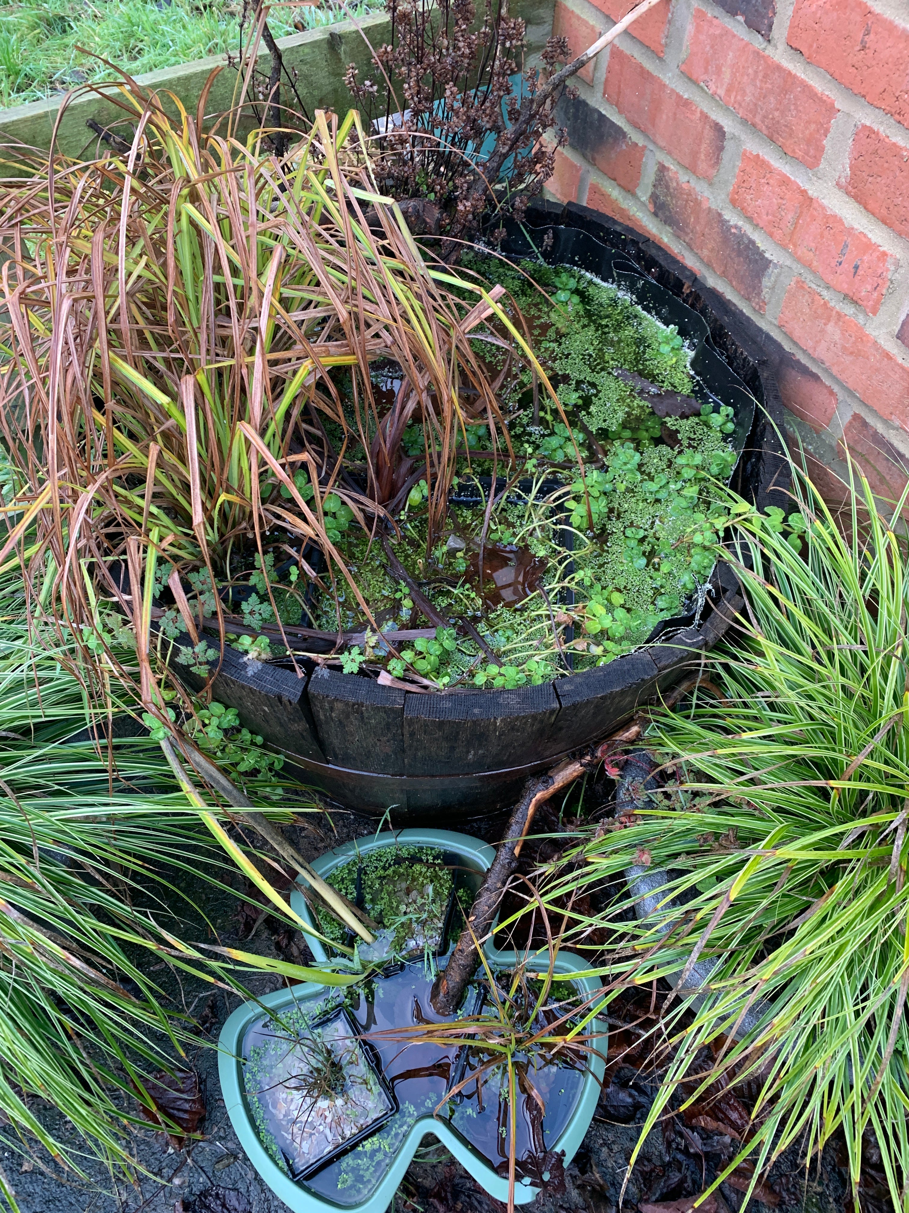 I pause to admire the barrel pond I created last summer. The ponds glass like surface is still. Nothing stirs beneath. More dead leaves are swirled across the surface. I’ve accepted that my miniature ponds are unlikely to be home to amphibians but may act as a nice little pit stop on their way to larger ponds and water sources. It also works well as a bird bath and drinking station for many of the garden birds.