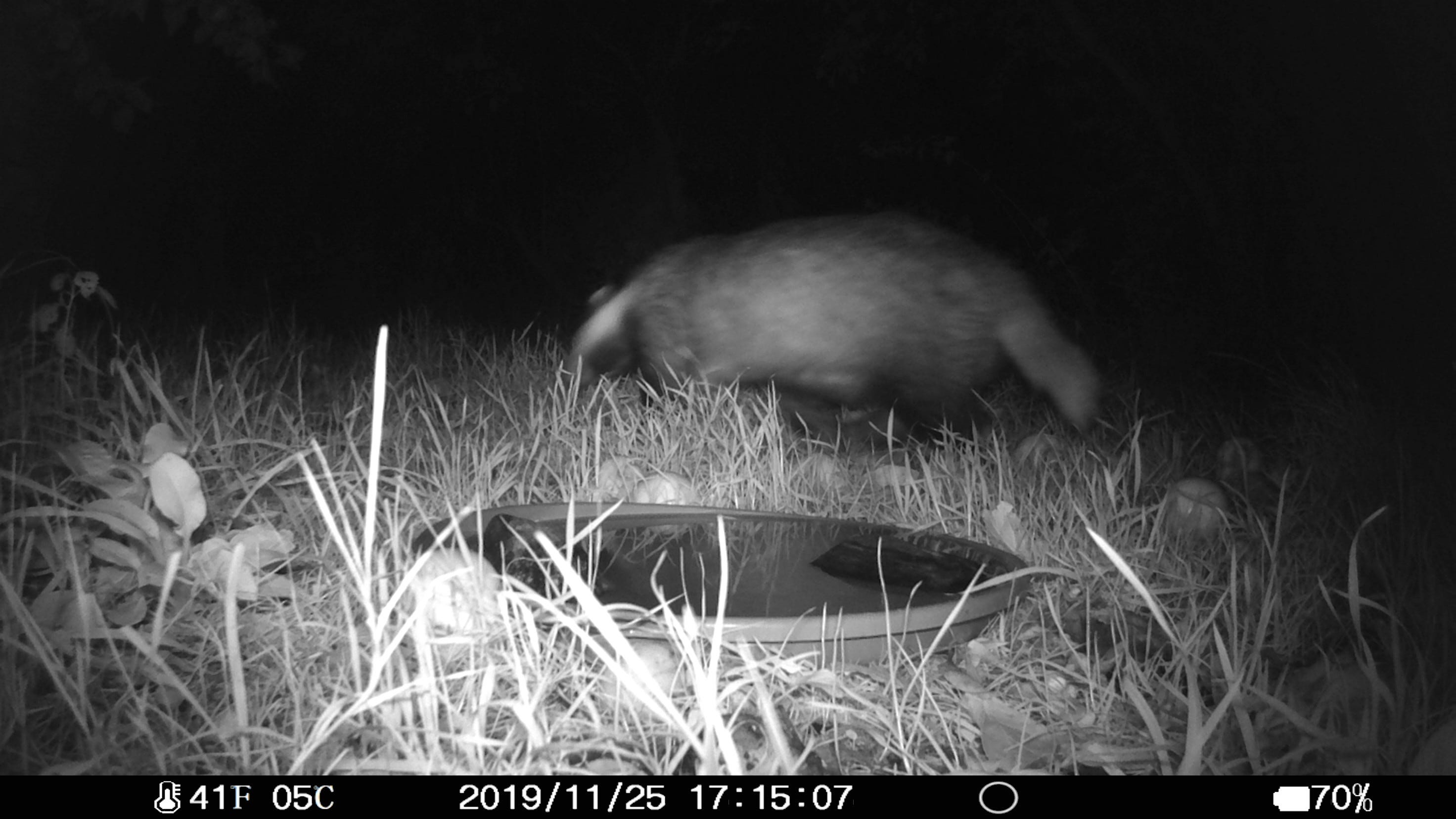 The camera was quiet on the badger front for a little while, but now at least one of the badgers is back on a nightly basis. We had a bumper harvest of plums this year and the ground was littered with them. Amazingly we didn’t have a problem with wasps, as within a night most of the plums would be stripped of their flesh and only the plum stones remained. The badger even visits the water bowl on occasion which is always a treat.